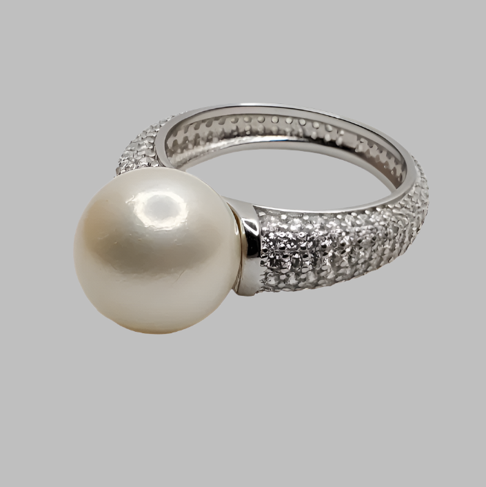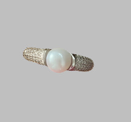 The Ashley ring a stunning sterling silver ring featuring CZ crystals on the entire band.. Ideal for 11mm or smaller pearls.