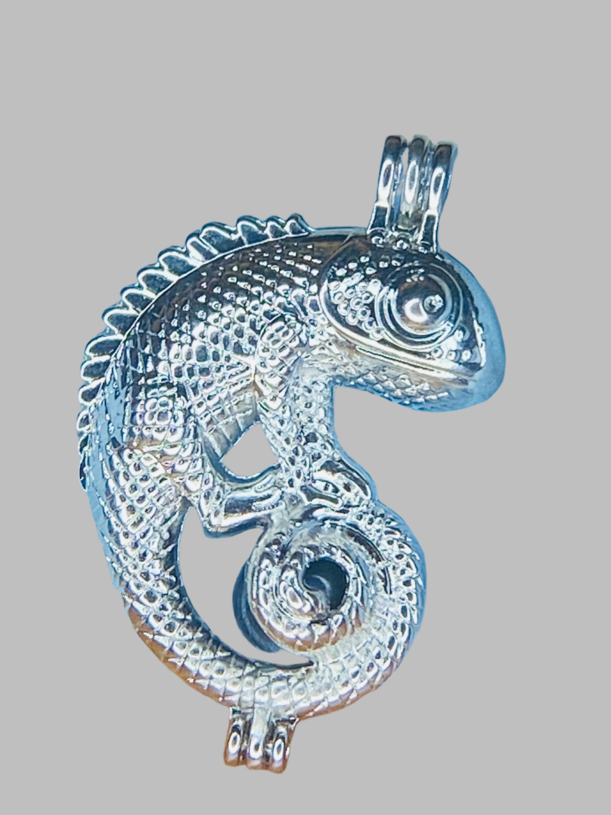 Silver plated chameleon cage holds pearls up to 8mm. Create different looks with easy to change cage and match your necklace with your current colors or moods.