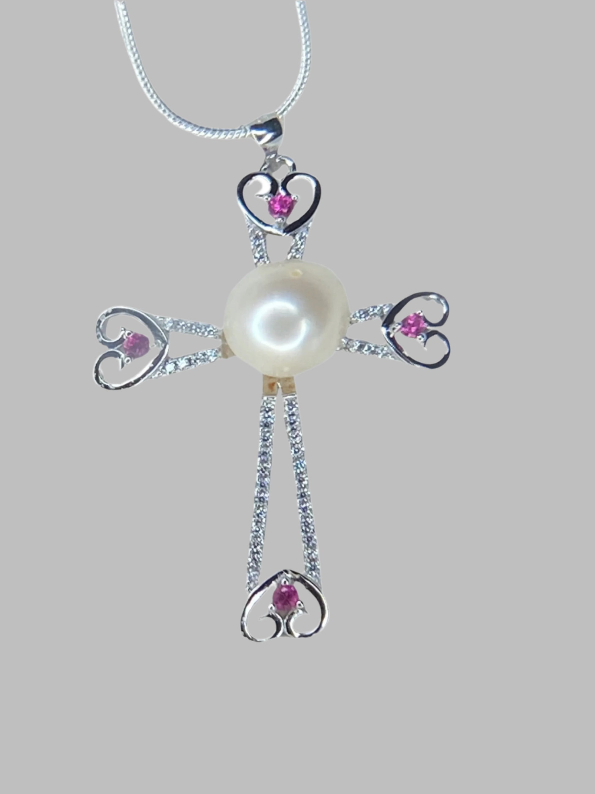 Beautiful sterling silver cross with white CZs and pink crystals. . Comes in both freshwater and Edison options.