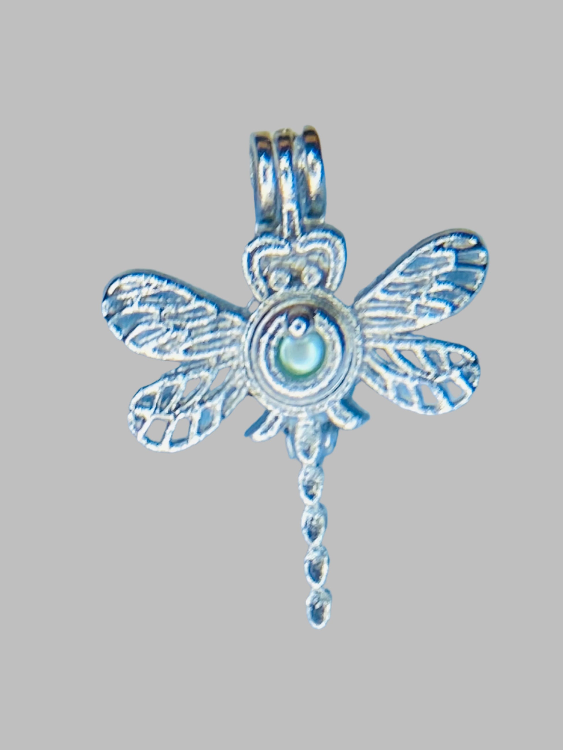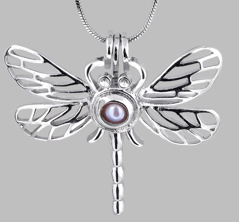 Silver plated dragonfly cage holds pearls up to 8mm. Create different looks with easy to change cage and match your necklace with your current colors or moods.