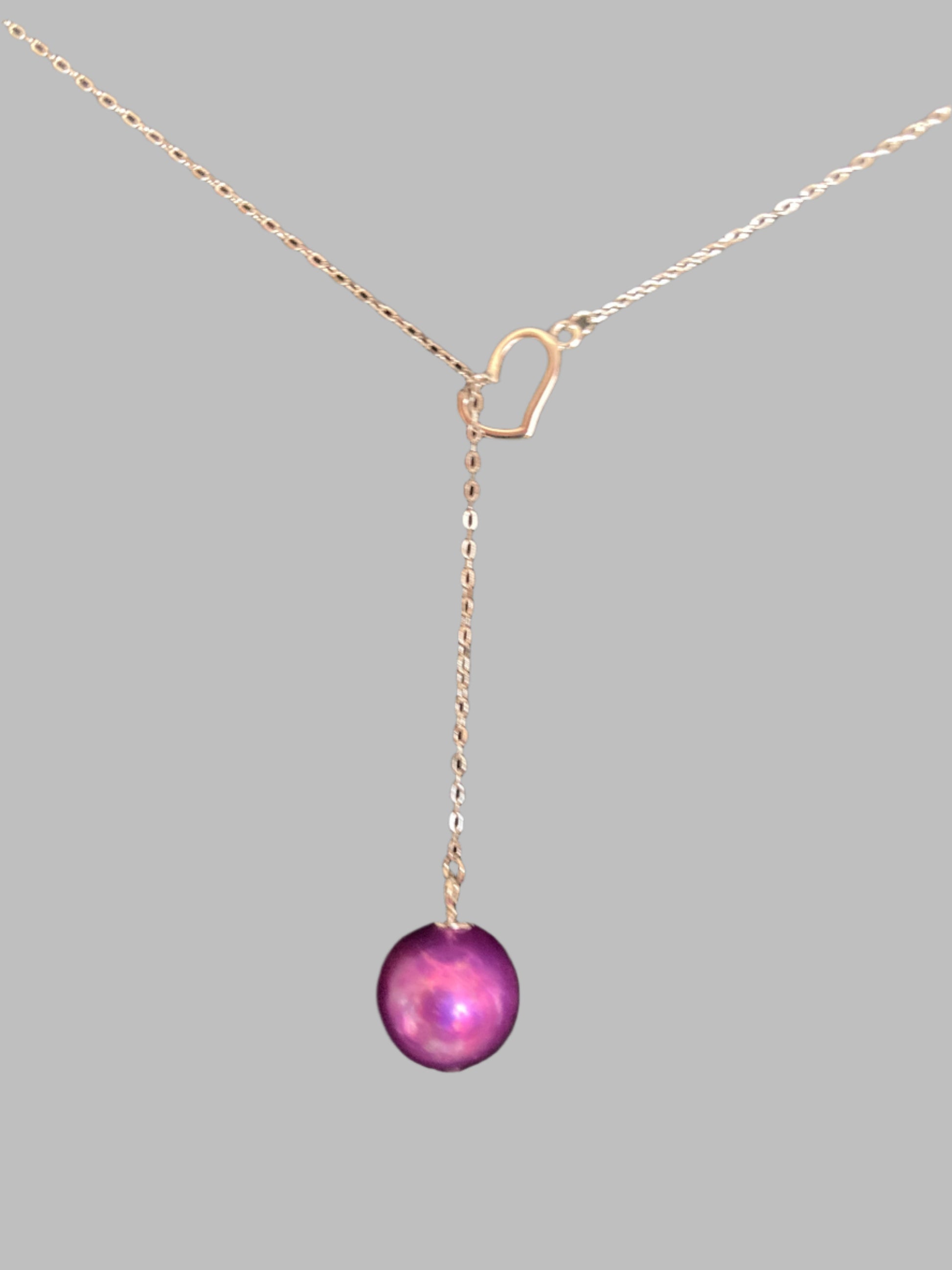 This sterling silver necklace features a delicate heart with a slide thru chain displaying your one of a kind pearl at the end. Frehwater and Edison sizes available.