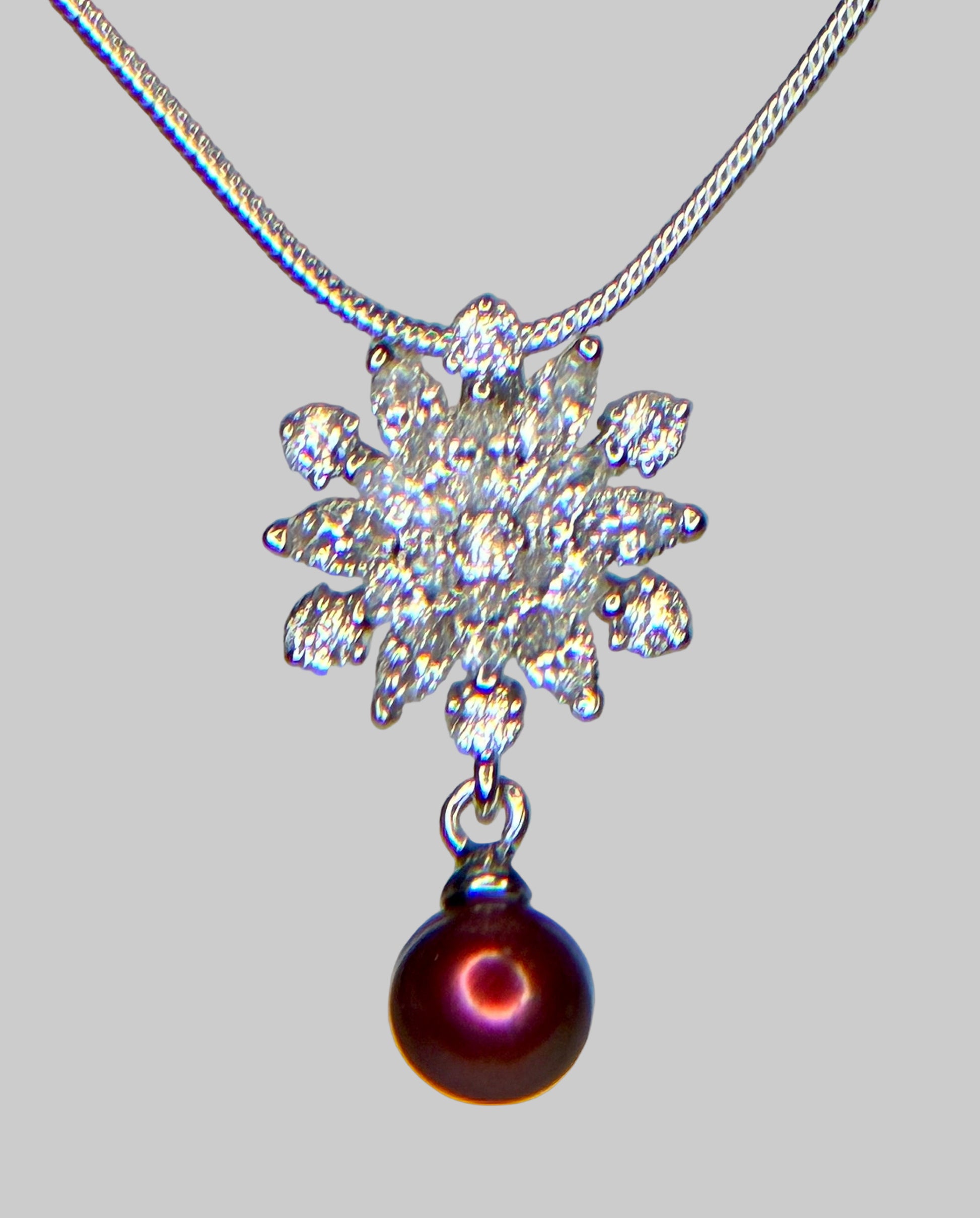 Silver plated snowflake necklace is covered in CZs and holds pearls up to 12mm.