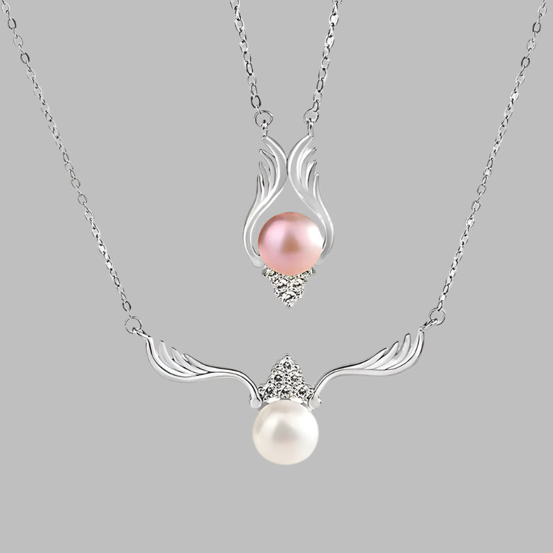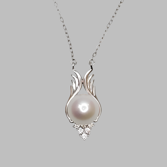 This one of a kind sterling silver necklace has magnetic wings that can be open or closed. Freshwater and Edison sizes available.